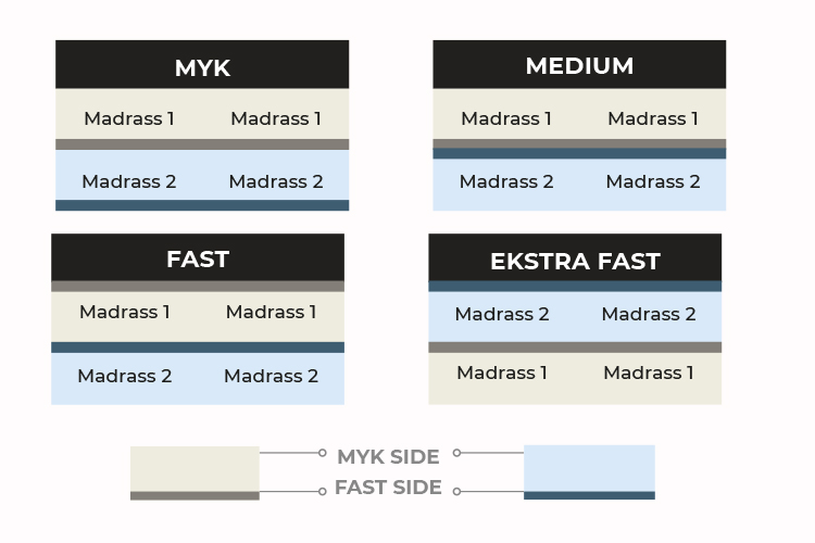 The fact that a bed has the Svane FlexSystem means that you can change and turn the main mattresses and lower mattresses to achieve the ultimate level of comfort and firmness. All mattresses have a firm side and a softer side. By turning the two layers of sprung mattresses in different ways, you ensure a whole four degrees of firmness in one and the same bed. A smart and unique feature that you only get with Svane beds. The Svane FlexSystem gives you adjustable firmness, customized comfort and longer durability.