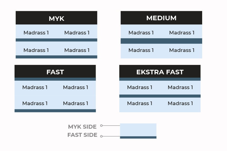 The fact that a bed has the Svane FlexSystem means that you can change and turn the main mattresses and lower mattresses to achieve the ultimate level of comfort and firmness. All mattresses have a firm side and a softer side. By turning the two layers of sprung mattresses in different ways, you ensure a whole four degrees of firmness in one and the same bed. A smart and unique feature that you only get with Svane beds. The Svane FlexSystem gives you adjustable firmness, customized comfort and longer durability.